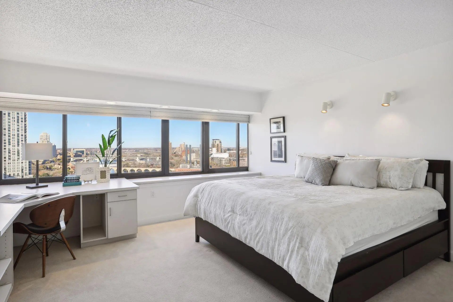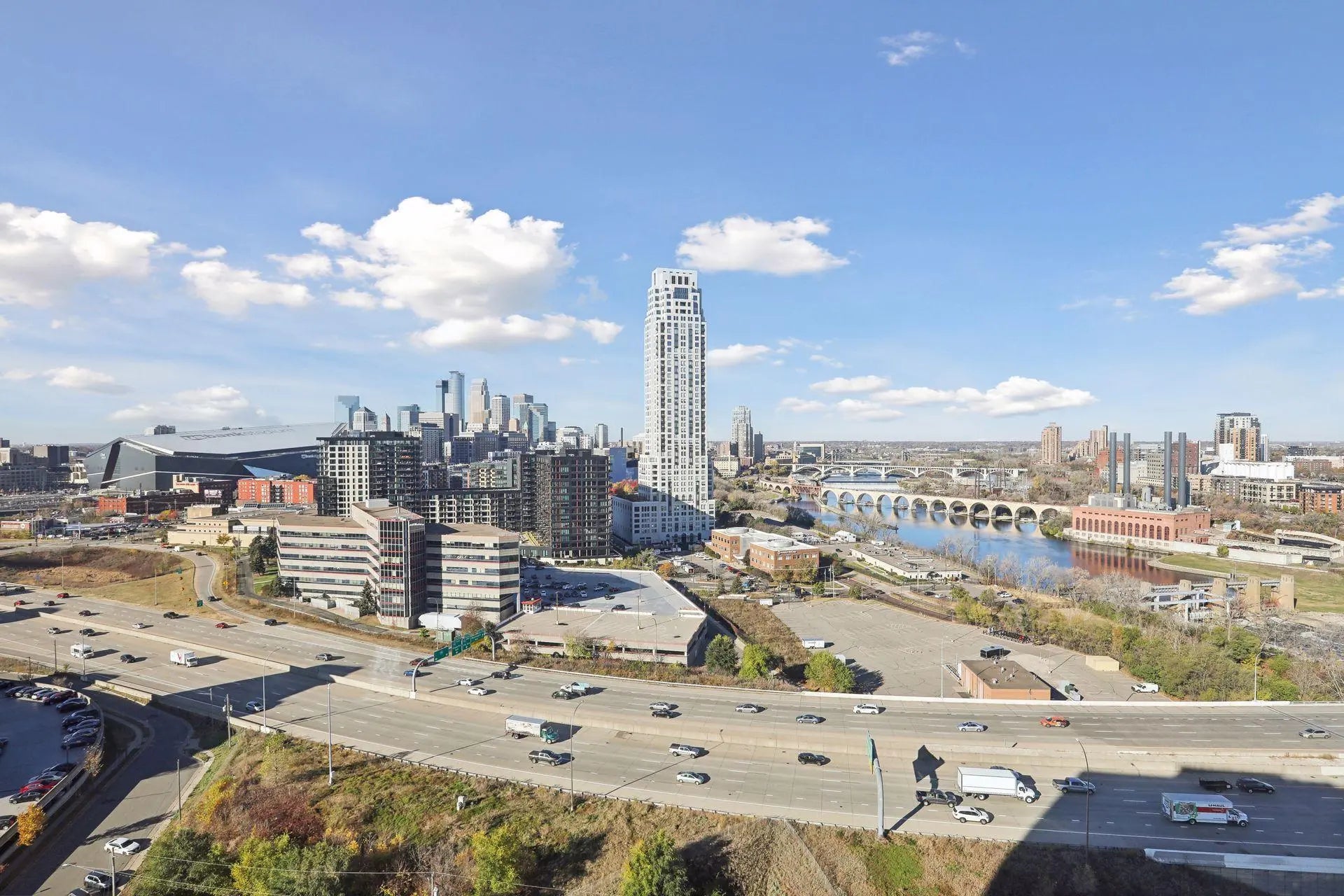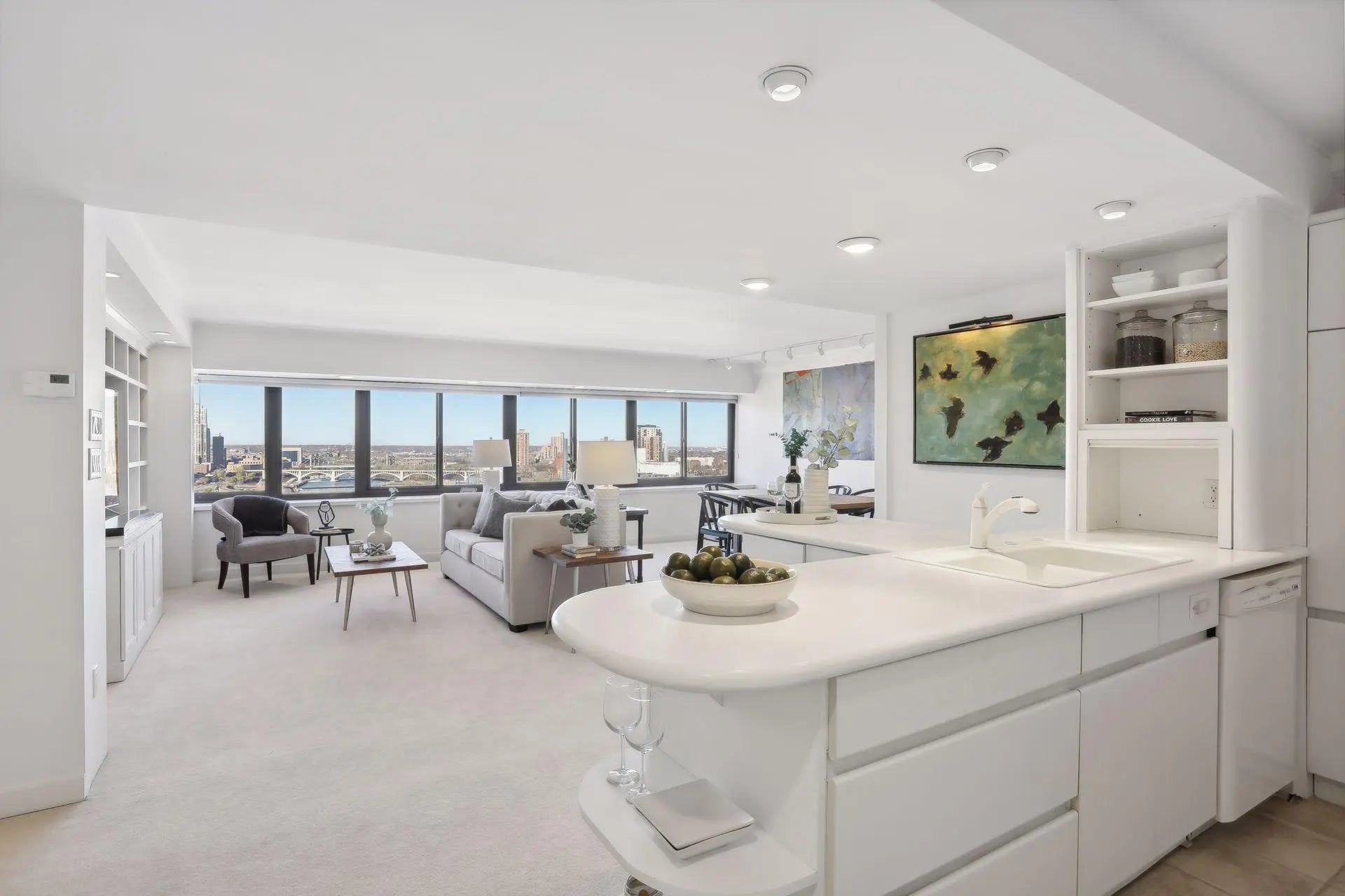 Sophisticated city living at Riverview Towers! This 20th floor location facing the Mississippi River, falls and city skyline feels like stepping into an art gallery - with bright natural light and fresh interior providing the backdrop for your furnishings and the amazing view. This unit was originally a 2 bedroom floorplan but was remodeled to increase the great room living space to fit living room and full dining area. The living space is open and connected to the kitchen which has lots of cabinetry and pantry storage. The living room also features a great wall of built-ins for a media center. There is a full bath on the hallway which leads to the primary suite. The bedroom includes a terrific wall unit with desk and storage. The ensuite bath is a 3/4 bath with walk-in shower. This floorplan also features a large storage closet within the unit. Riverview Towers is an established condo community where Community living is comprehensive; monthly HOA includes all utilities, basic cable, internet, heated indoor pool, whirlpool, fitness room, sauna, outdoor patio with gas grills, community rm w kitchen, package room, prof. mgmt. NEW HOA policy as of June 2025, association is permitting rentals (with restrictions), and pets (with restrictions.) Tucked away near the U of M law school, easy access to downtown, the University area, highways to anywhere you want to go.